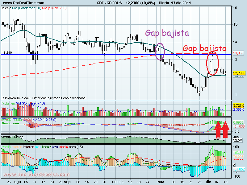 Curiosamente si vemos el gráfico de diario podemos observar que el precio en esta subida tan impresionante de una semana se ha parado en el soporte del gap situado en los 13,28€ que dibujó cuando rompió el soporte. El caso es que ahora una vez hizo techo en los 13,28€ al caer volvió a dibujar un nuevo gap en los niveles de los 12,50€-13€.